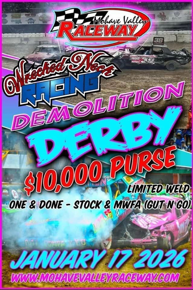 Experience the thrill of the demolition derby with Wrecked Neck Racing at the Mohave Valley Raceway on January 17, 2026. Show starts at 2pm! Registration is online or cash only in person. Tickets for grand stand seats will be available the day of.